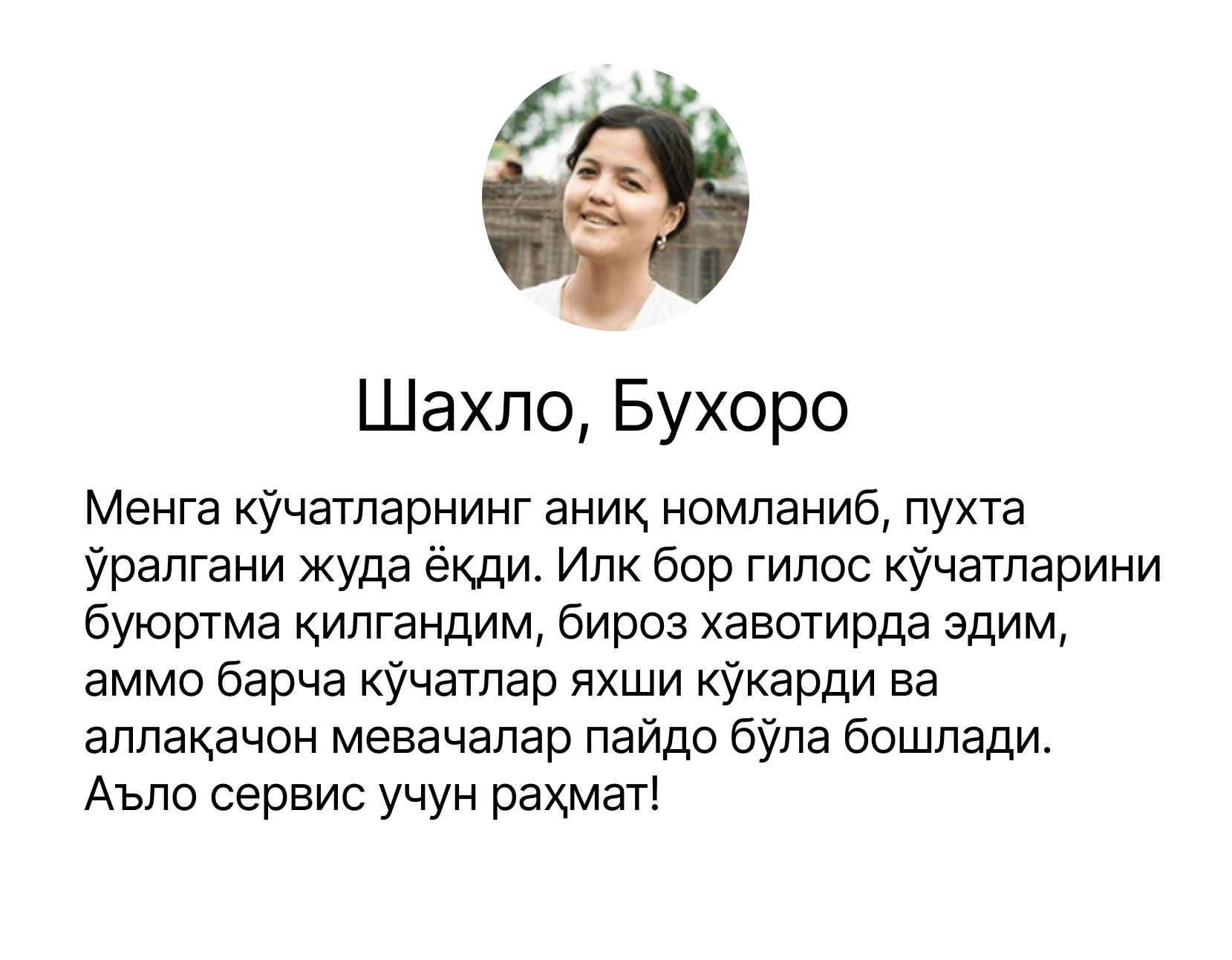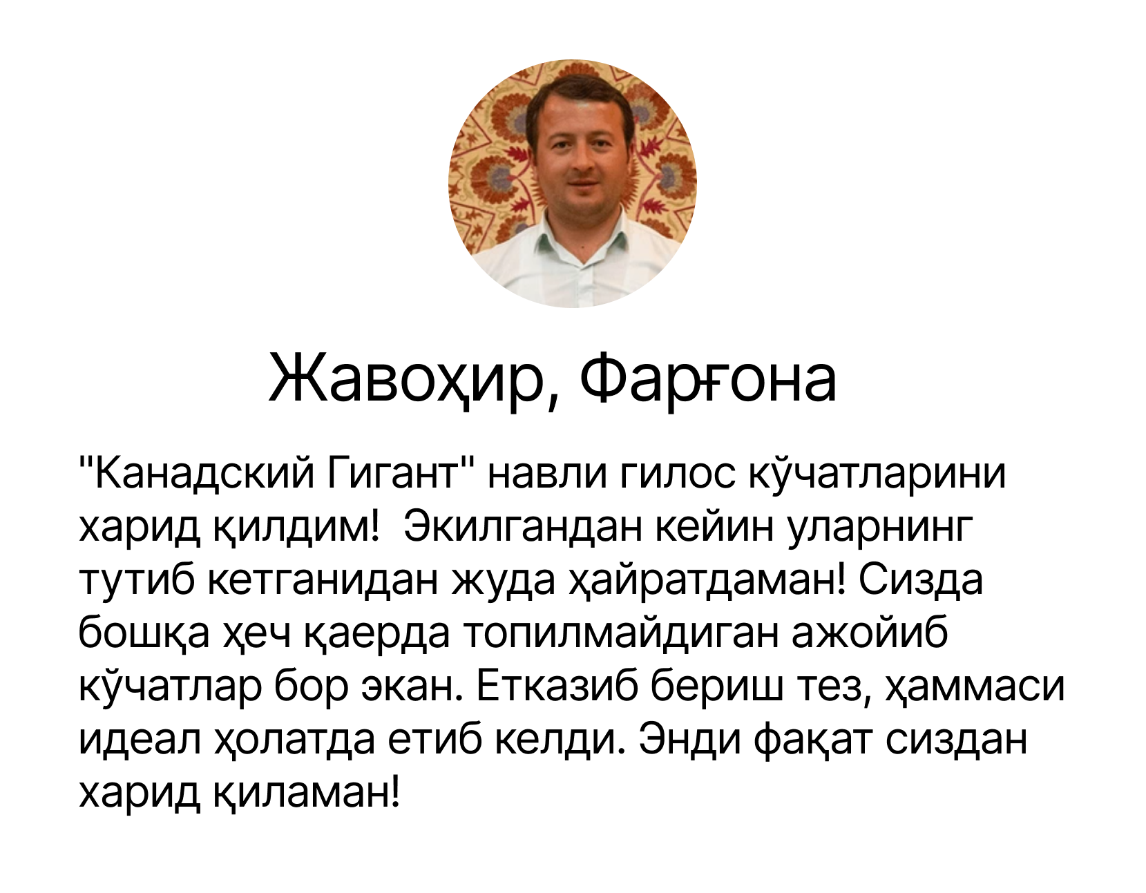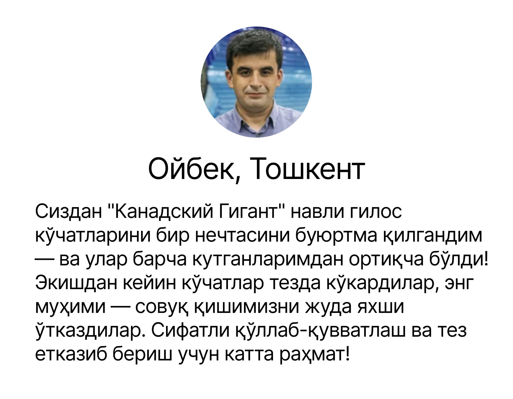 Бизнинг кўчатларимиз бутун Ўзбекистон бўйлаб боғбонлар томонидан фаол тавсия қилинади.