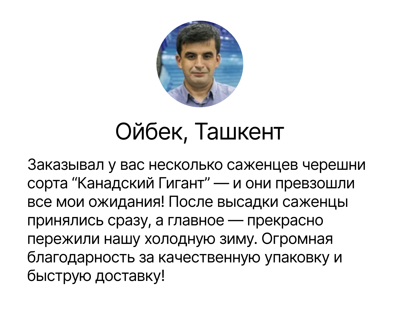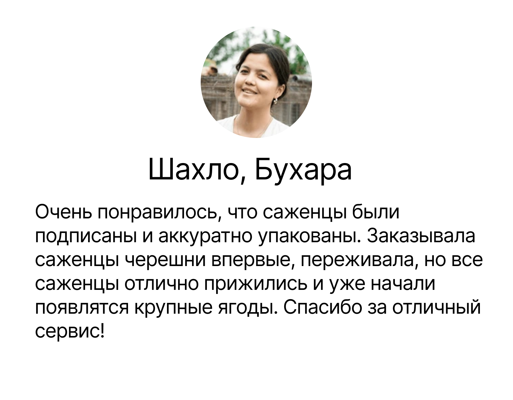 Мы тщательно упаковываем каждый саженец, чтобы он безопасно доехал до вас даже в самые суровые зимние месяцы. Наша специальная упаковка сохраняет влагу корневой системы до 10 дней, обеспечивает защиту от мороза и повреждений. Упаковка гарантирует, что ваши саженцы черешни останутся в идеальном состоянии до момента посадки и не пострадают во время транспортировки.