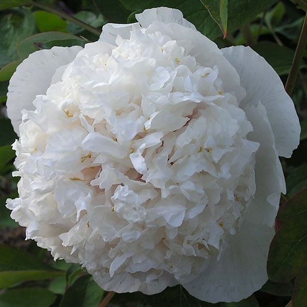 1. Цветы пиона Снежная башня нежно-белого оттенка. Но у основания лепестков можно рассмотреть светло-оранжевый мазок.